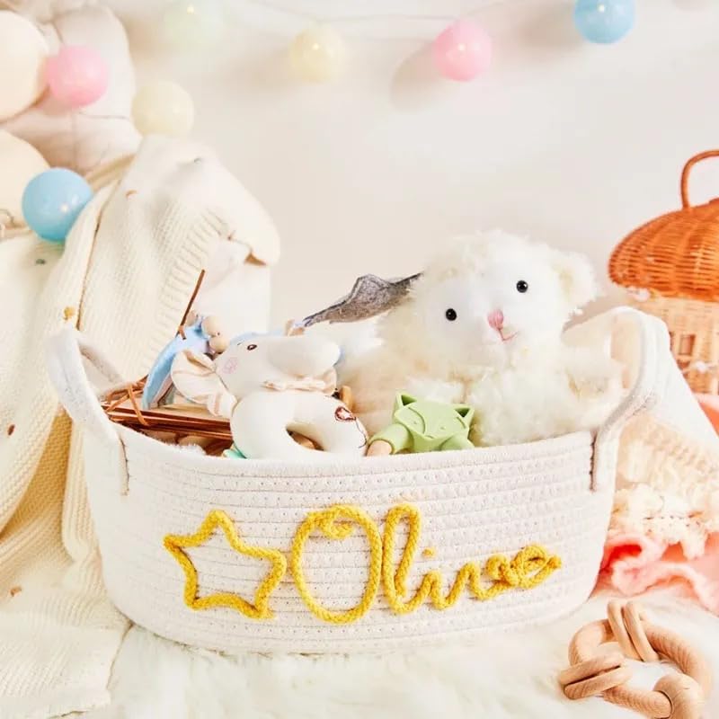 Personalized Baby Name Basket Custom Baby Diaper Stuff Organizer with Cotton Rope Handle Baby Shower Gift Nursery Storage Bin Solution (Style E)