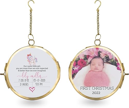 Baby Girl's 1st First Christmas Ornaments with Birth Stats, Baby's 1st Christmas Bauble, Personalised Newborn Baby Photo Ornament 2022 (Brass & Glass Ornament, 3.25 inch)