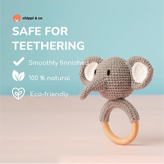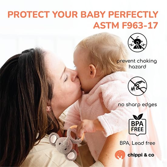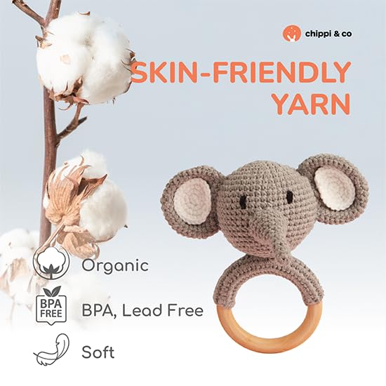 SAFE & NON-TOXIC MATERIALS: Our crochet rattle meets rigorous US toy standards. Handcrafted from organic cotton, it offers a soft, odor-free experience. The wooden ring, made from natural wood, is BPA-free, non-toxic, and scent-free, with a smooth surface, making it a perfect, safe soothing toy for babies.