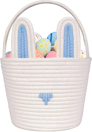 1.Aadorable easter bunny design - Handmade cotton rope basket is decorated with a pair of charming easter bunny ears, perfect for adding festive charm to egg hunts, home décor or gift giving during the holiday season.
