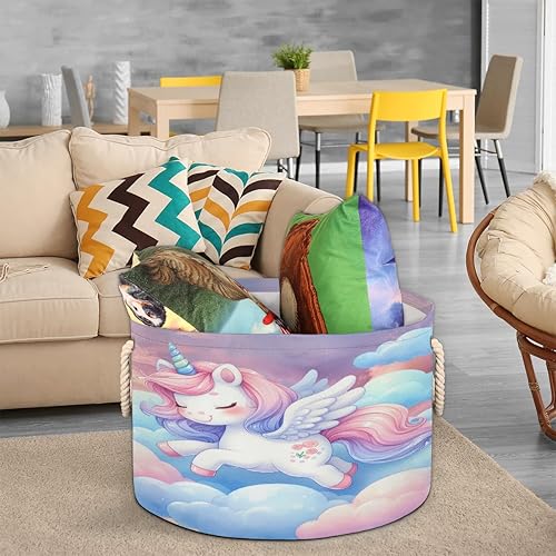 Large Round Laundry Basket Blue Lovly Unicorn Toy Organizers and Storage for Girls Canvas Collapsible Blanket Storage Basket Laundry Hamper Gift Baskets Bedroom Clothes Children Nursery