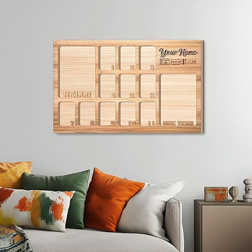 Neutral Monthly Baby Milestone Frame: Capture every precious moment of your baby's first year with this personalized photo frame. Crafted from two 1/4" wood sheets and an acrylic layer, this frame measures 12"x18.5", offering a perfect space for each monthly milestone. Ideal for decorating a nursery or displaying your baby's first-year photos, this frame includes a designated spot for newborn and one-year-old photos, making it an unforgettable keepsake for parents.