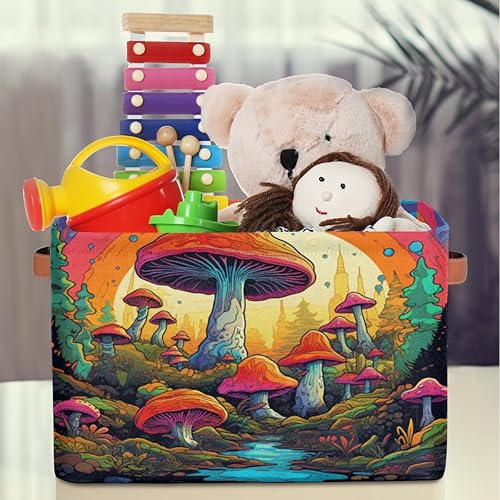 Storage Basket Colorful Mushrooms Fantasy Pattern Storage Bin Fabric Collapsible Toy Storage Box for Shelf Closet Bedroom Nursery Organizer Bins Kid Gift Basket with Handles, 1Pc(1 pack)