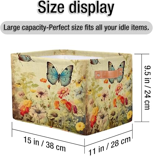 Storage Basket Retro Beautiful Wild Flowers Butterflies Storage Bin Fabric Collapsible Toy Storage Box for Shelf Closet Bedroom Nursery Organizer Bins Kid Gift Basket with Handles, 1Pc(1 pack)