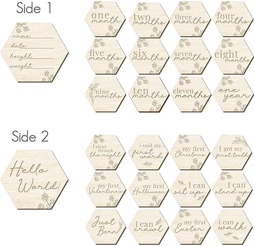 ✅ CELEBRATE MILESTONES WITH ORIGINAL HEXAGON SHAPES - Our 13 rustic card set of double-sided, laser engraved cards include 24 sayings so you can use the wooden monthly cards to save more memories that you will cherish forever! Each set includes 13 reversible cards that give you 11 months, 1 year, 8 special achievements, 4 holidays, and 1 customizable birth announcement card. Our monthly cards measure 4.1 inches, making them the perfect size to really stand out in your baby's monthly photos.